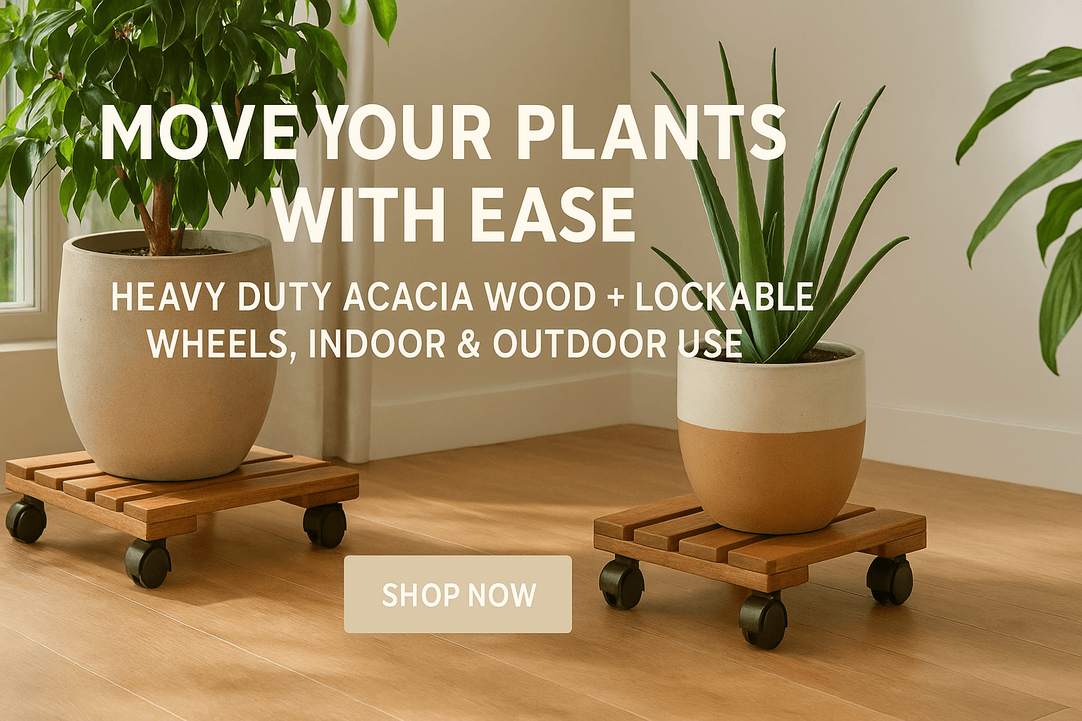 2 Pack 12" Square Wooden Plant Caddy with Lockable Wheels – Heavy Duty Acacia Wood Plant Stand for Large Pots, Indoor & Outdoor Use